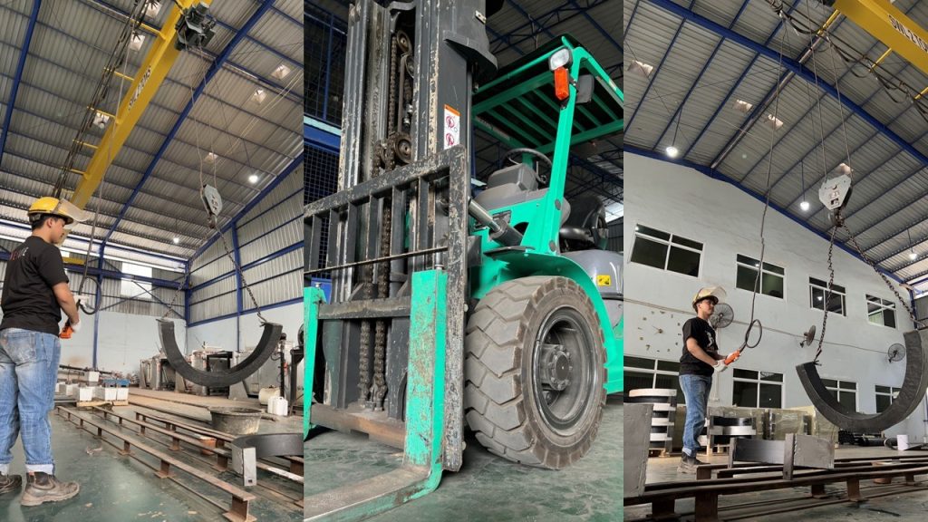 Overhead crane, forklifts, preheat ovens, rolling and bending machines, cutting and drilling stations, welding workstations, blasting room, and dedicated finishing areas.